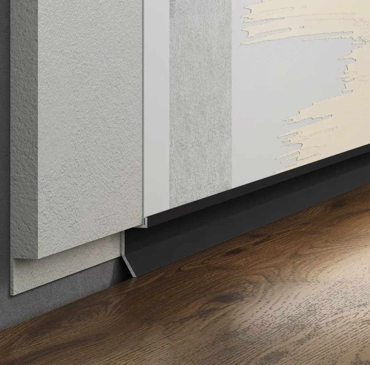 Самое прекрасное в этом плинтусе, это то, что его можно установить после всех отделочных работ и укладки напольного покрытия. А защитный борти профиля, будет беречь край отделки стены .