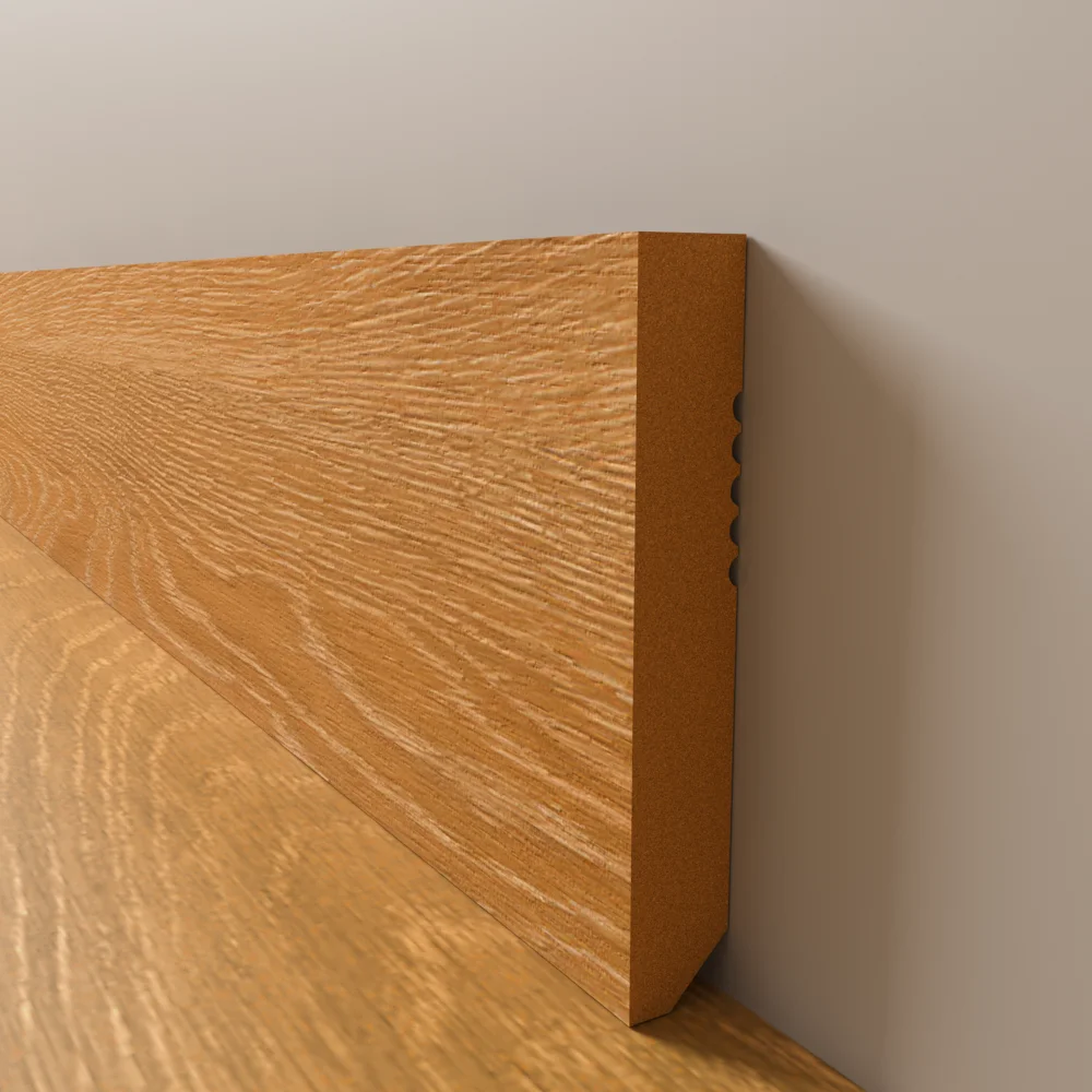 - ✔ Высокое качество шпона – лицевая часть выполнена из шпона отборных пород древесины, что придает плинтусу благородный внешний вид.
